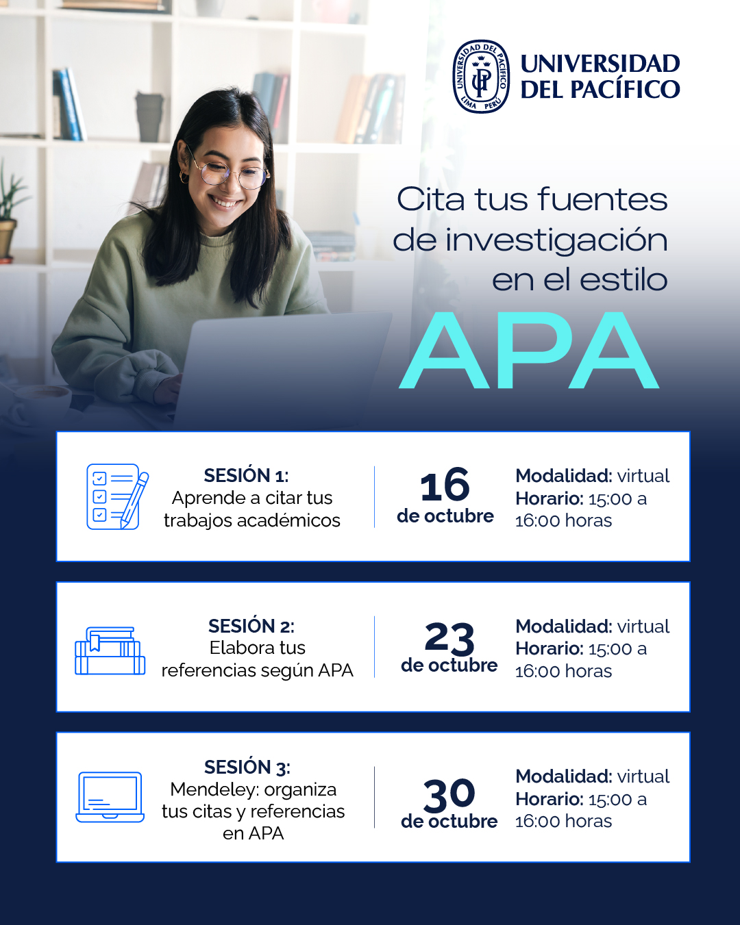 Cuando realizas tus trabajos académicos debes citar las fuentes de información que has utilizado para no incurrir en situaciones de plagio. En estas sesiones te mostraremos cómo citar y referenciar correctamente con la ayuda del estilo APA todos los jueves a las 3:00 p.m. Inscríbete aquí